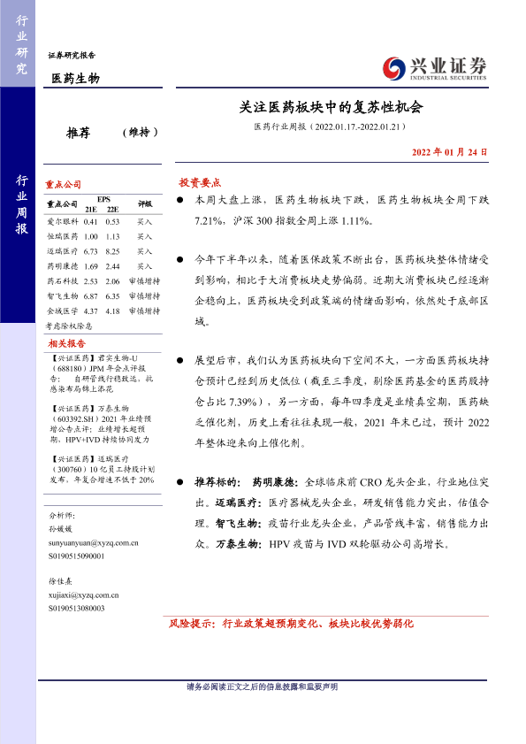 【兴业证券】【20220124】医药行业周报:关注医药板块中的复苏性机会-12页
