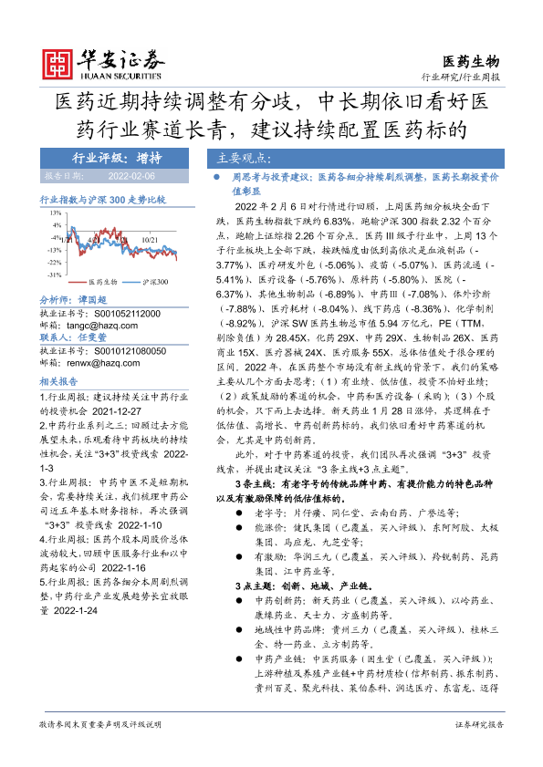 【华安证券】【20220206】医药生物行业周报:医药近期持续调整有分歧,中长期依旧看好医药行业赛道长青,建议持续配置医药标的-12页