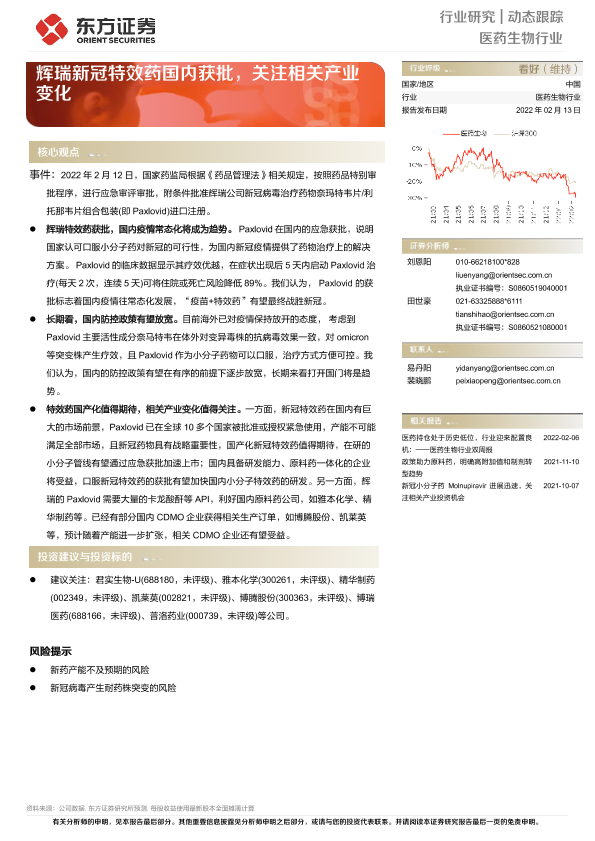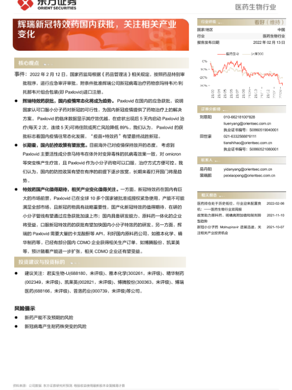 【东方证券】【20220213】医药生物行业动态跟踪:辉瑞新冠特效药国内获批,关注相关产业变化-3页