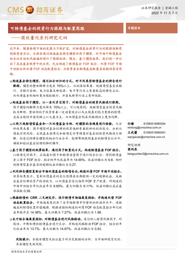 FOF组合 动态配置 因子模型 投资行为跟踪 可转债基金
