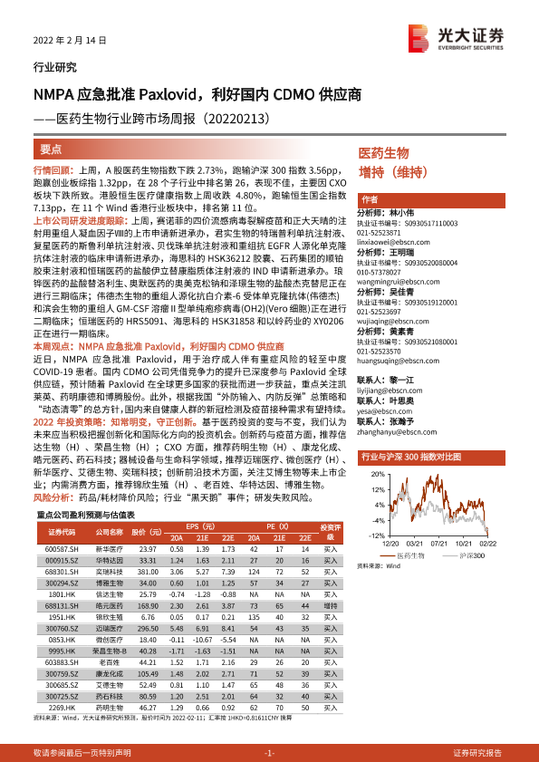 【光大证券】【20220214】医药生物行业跨市场周报:NMPA应急批准Paxlovid,利好国内CDMO供应商-25页