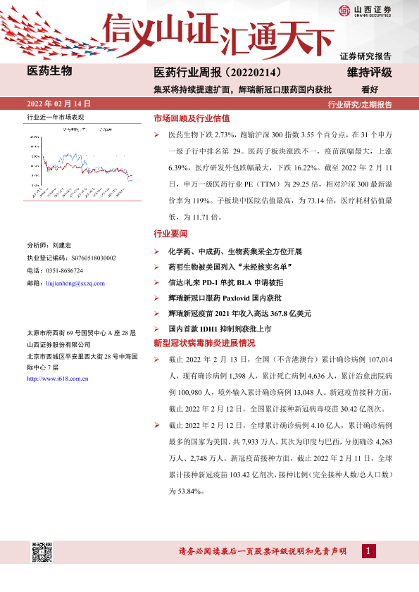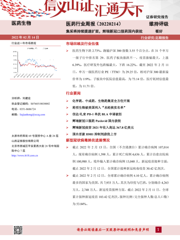 【山西证券】【20220214】医药行业周报:集采将持续提速扩面,辉瑞新冠口服药国内获批-10页