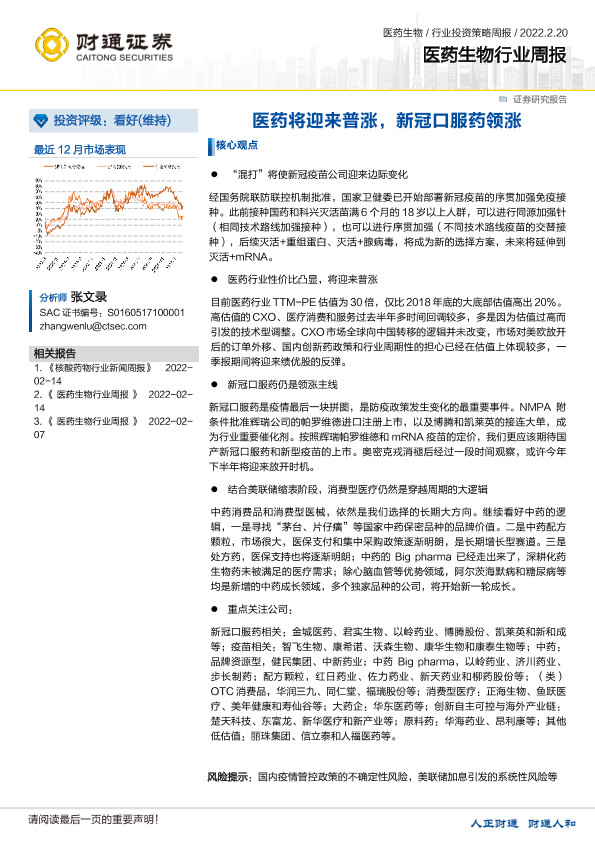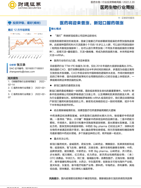 【财通证券】【20220220】医药生物行业周报:医药将迎来普涨,新冠口服药领涨-12页