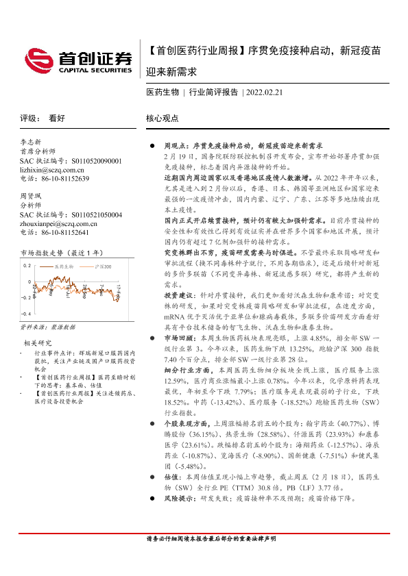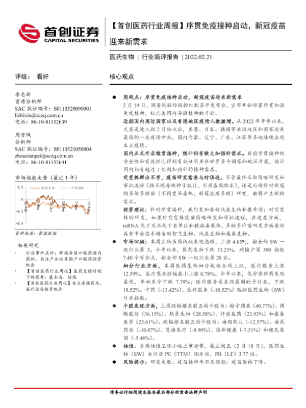 【首创证券】【20220221】首创医药行业周报:序贯免疫接种启动,新冠疫苗迎来新需求-11页