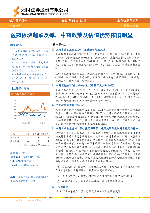 【湘财证券】【20220222】中药行业周报:医药板块超跌反弹,中药政策及估值优势依旧明显-11页