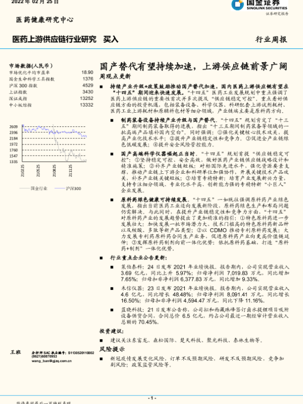 【国金证券】【20220225】医药上游供应链行业研究:国产替代有望持续加速,上游供应链前景广阔-5页