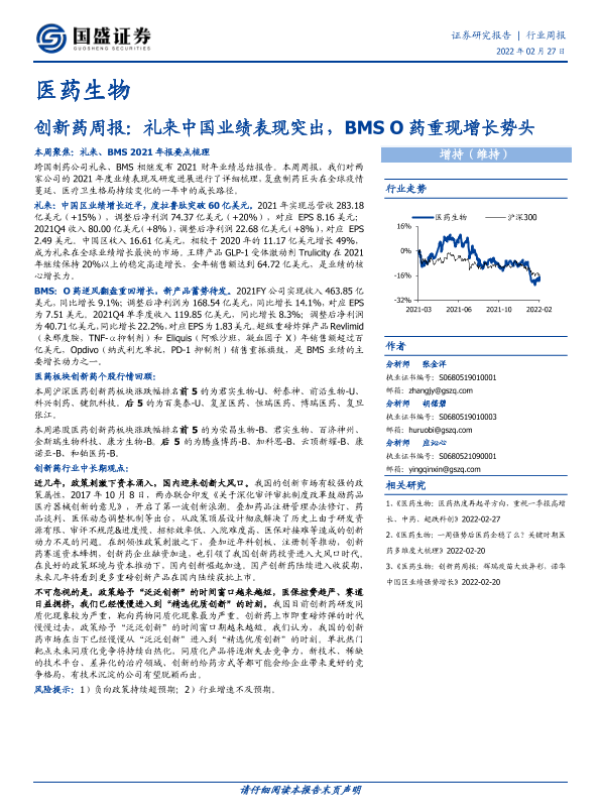 【国盛证券】【20220227】创新药周报:礼来中国业绩表现突出,BMS O药重现增长势头-37页