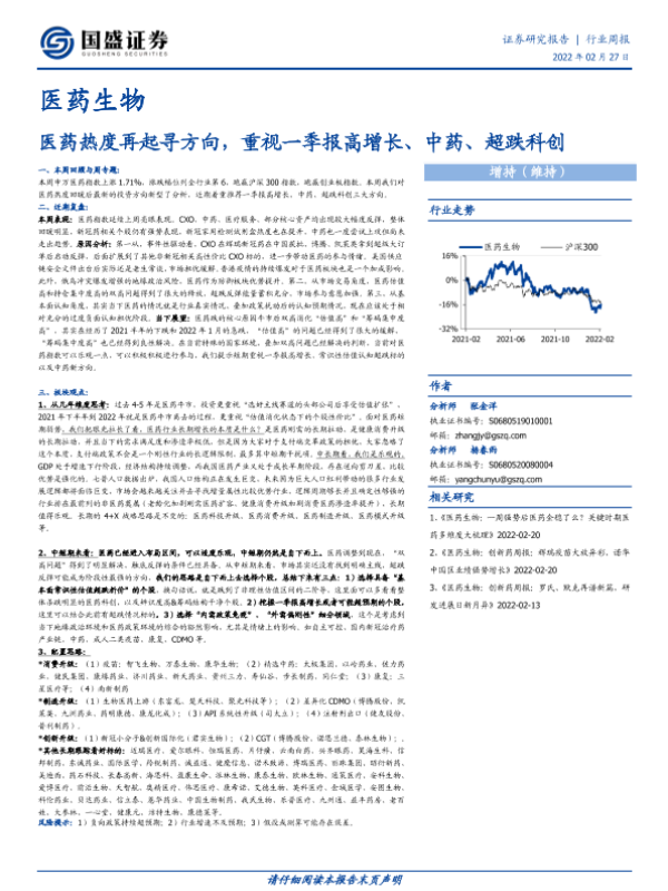 【国盛证券】【20220227】医药生物行业周报:医药热度再起寻方向,重视一季报高增长、中药、超跌科创-25页