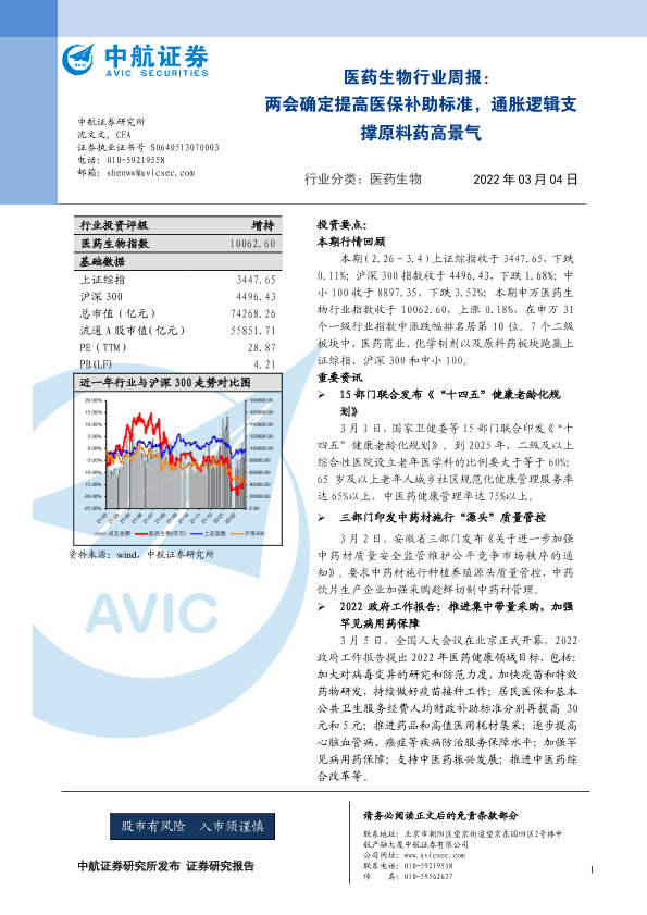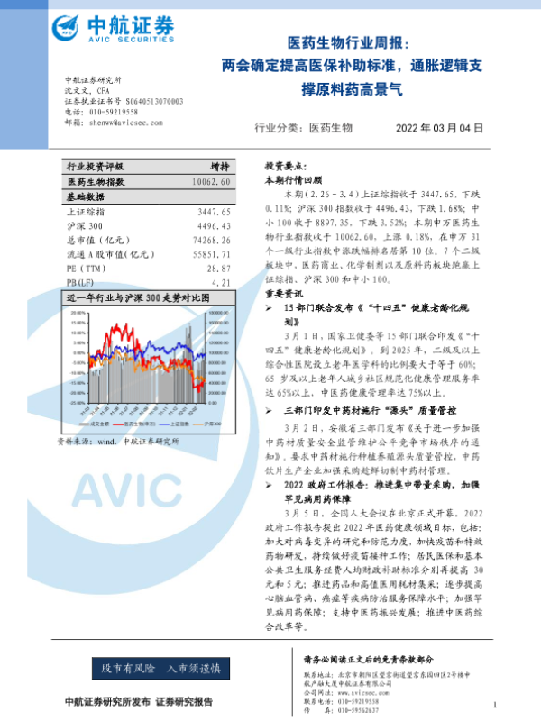 【中航证券】【20220304】医药生物行业周报:两会确定提高医保补助标准,通胀逻辑支撑原料药高景气-21页