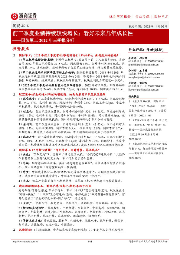 【浙商证券】【20221106】国防军工行业2022年三季报分析:前三季度业绩持续较快增长;看好未来几年成长性-18页