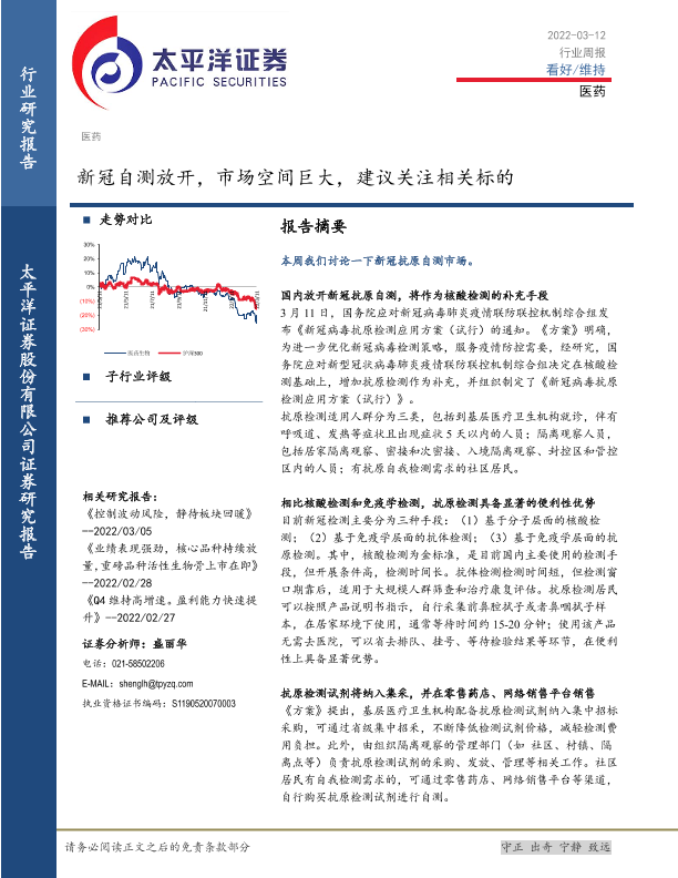 【太平洋证券】【20220312】医药行业周报:新冠自测放开,市场空间巨大,建议关注相关标的-20页