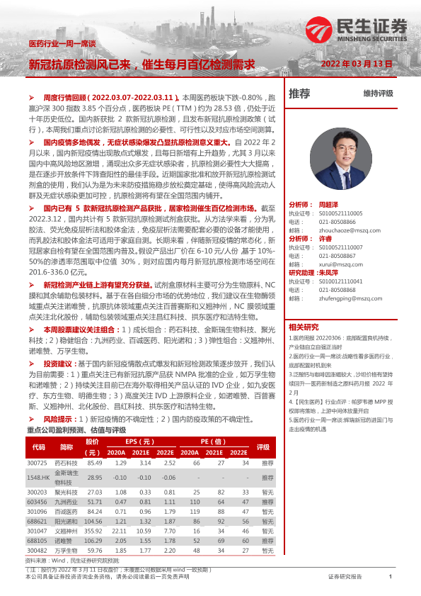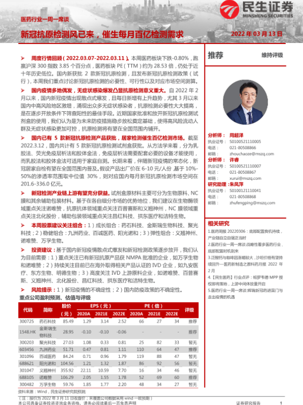 【民生证券】【20220313】医药行业一周一席谈:新冠抗原检测风已来,催生每月百亿检测需求-11页