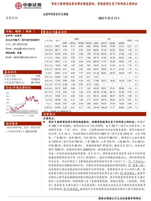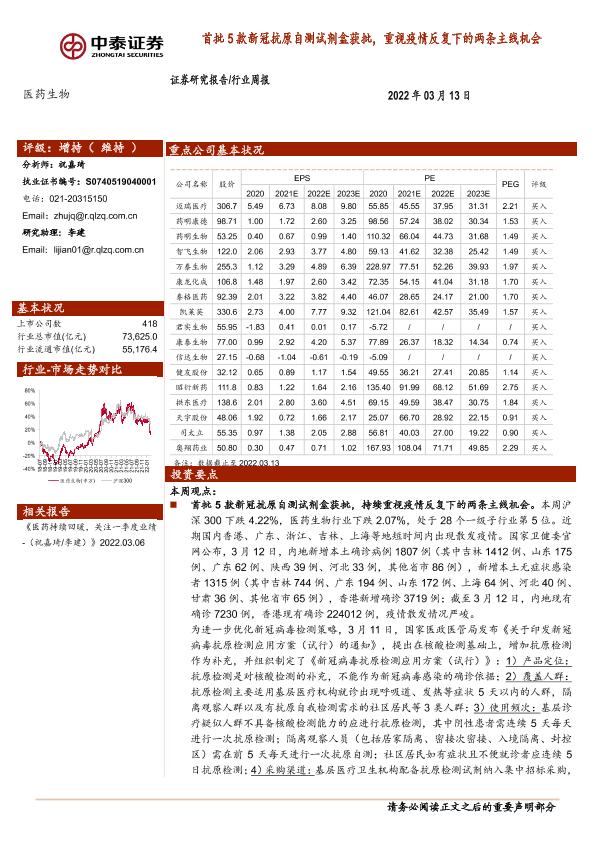 【中泰证券】【20220313】首批5款新冠抗原自测试剂盒获批,重视疫情反复下的两条主线机会-11页