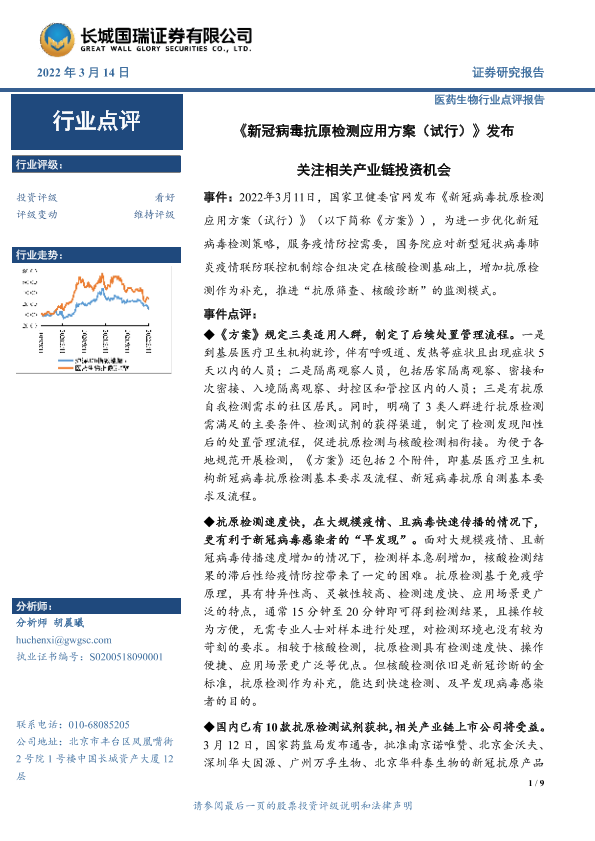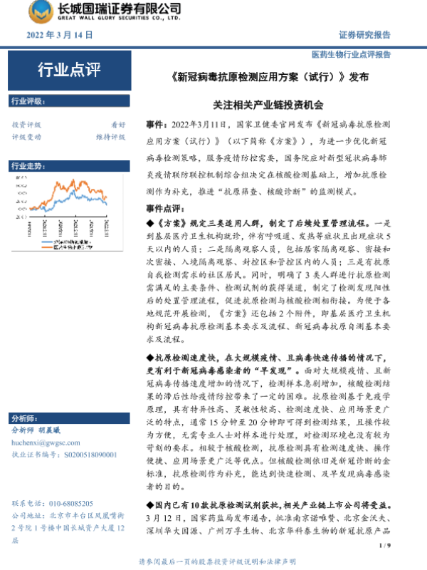 【长城国瑞证券】【20220314】新冠病毒抗原检测应用方案(试行)发布 关注相关产业链投资机会-9页