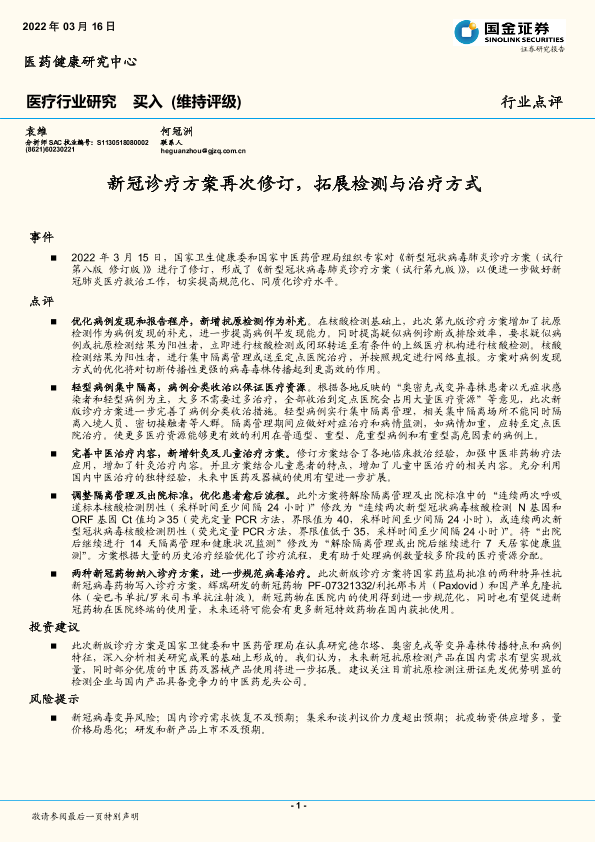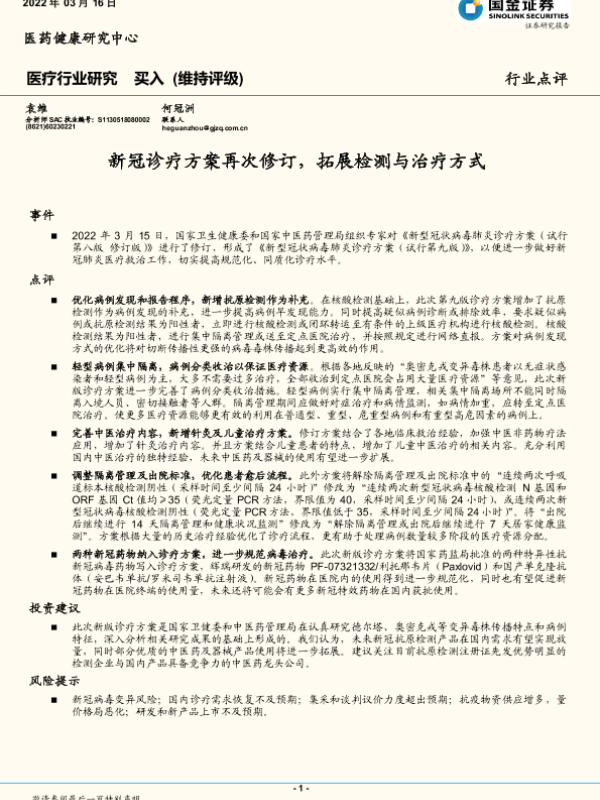 【国金证券】【20220316】新冠诊疗方案再次修订,拓展检测与治疗方式-3页