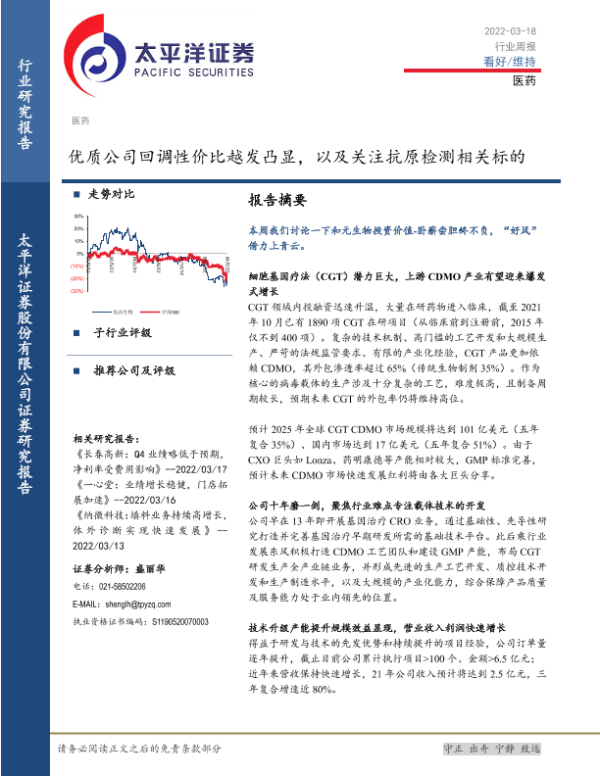 CDMO 医药行业 投资价值 抗原检测 细胞基因疗法
