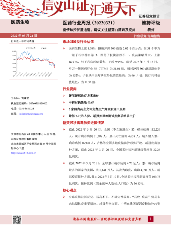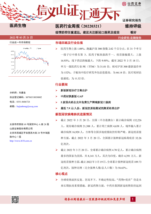 【山西证券】【20220321】医药行业周报:疫情防控任重道远,建议关注新冠口服药及疫苗-9页