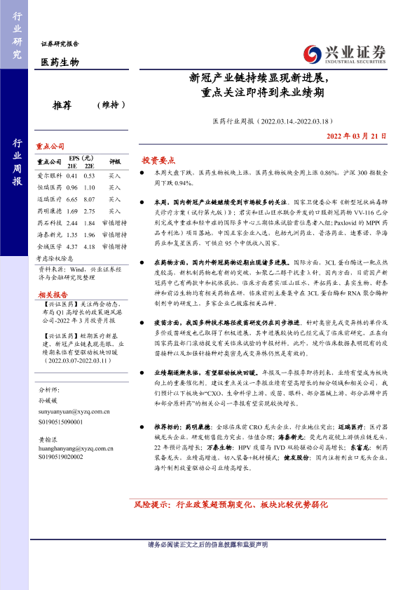 【兴业证券】【20220321】新冠产业链持续显现新进展,重点关注即将到来业绩期-13页