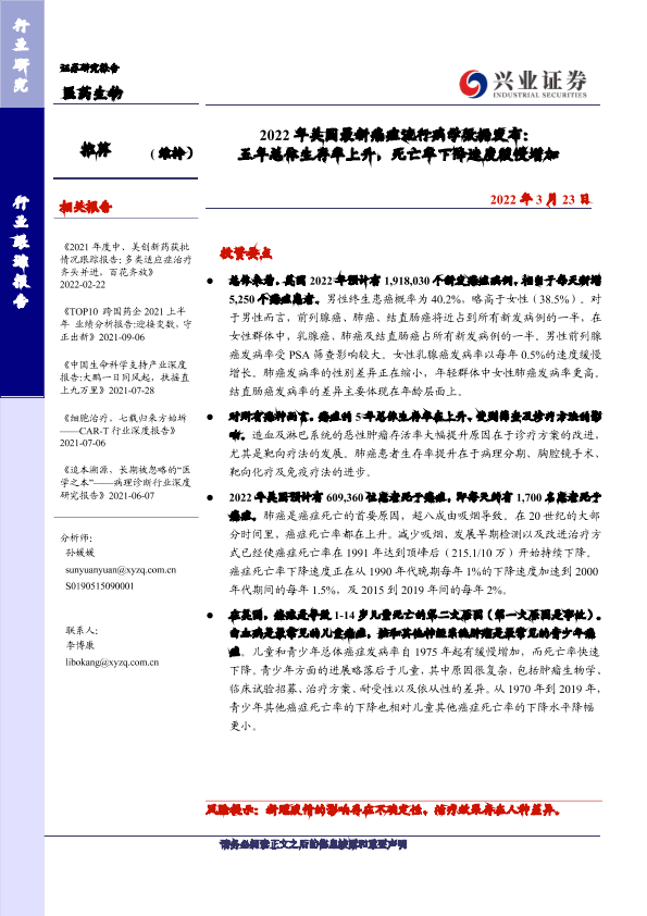 【兴业证券】【20220323】2022年美国最新癌症流行病学数据发布:五年总体生存率上升,死亡率下降速度缓慢增加-20页