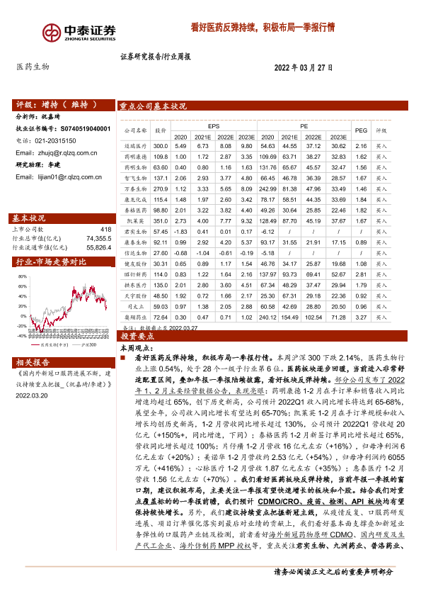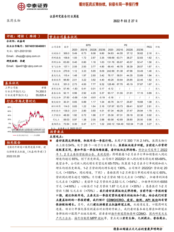 【中泰证券】【20220327】医药生物行业周报:看好医药反弹持续,积极布局一季报行情-13页