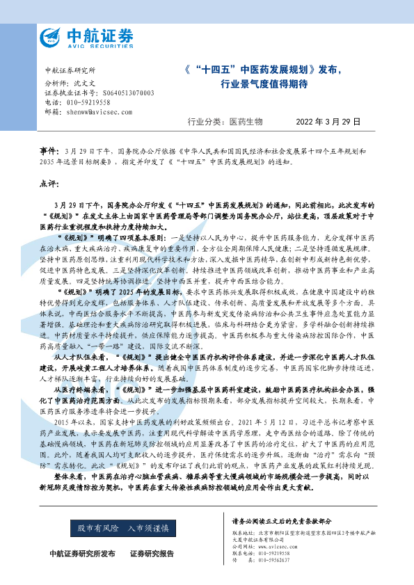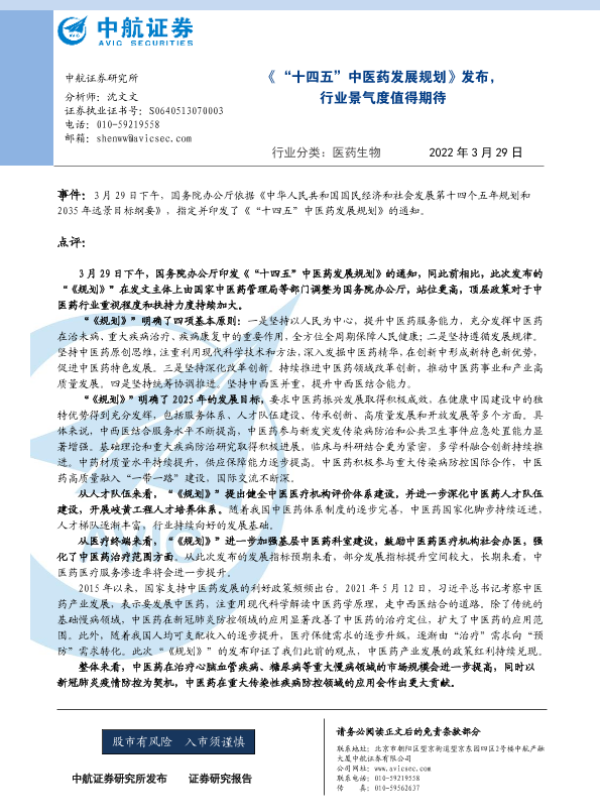 【中航证券】【20220329】“十四五”中医药发展规划发布,行业景气度值得期待-4页