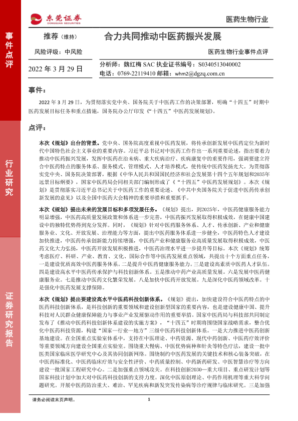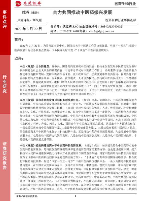【东莞证券】【20220329】医药生物行业事件点评:合力共同推动中医药振兴发展-3页