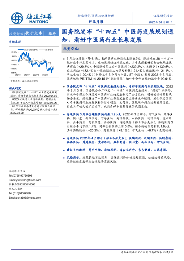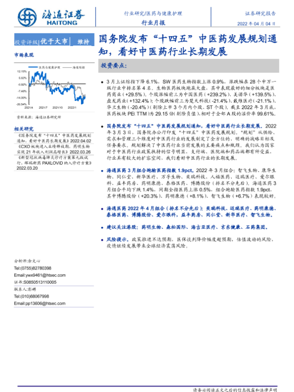 【海通证券】【20220404】医药与健康护理行业月报:国务院发布“十四五”中医药发展规划通知,看好中医药行业长期发展-5页