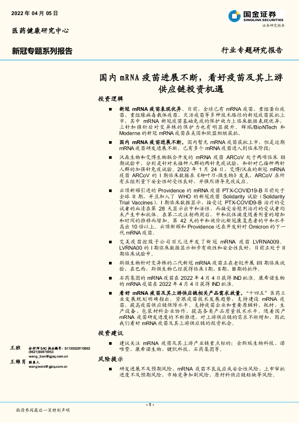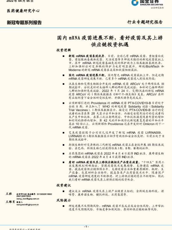 【国金证券】【20220405】国内mRNA疫苗进展不断,看好疫苗及其上游供应链投资机遇-16页