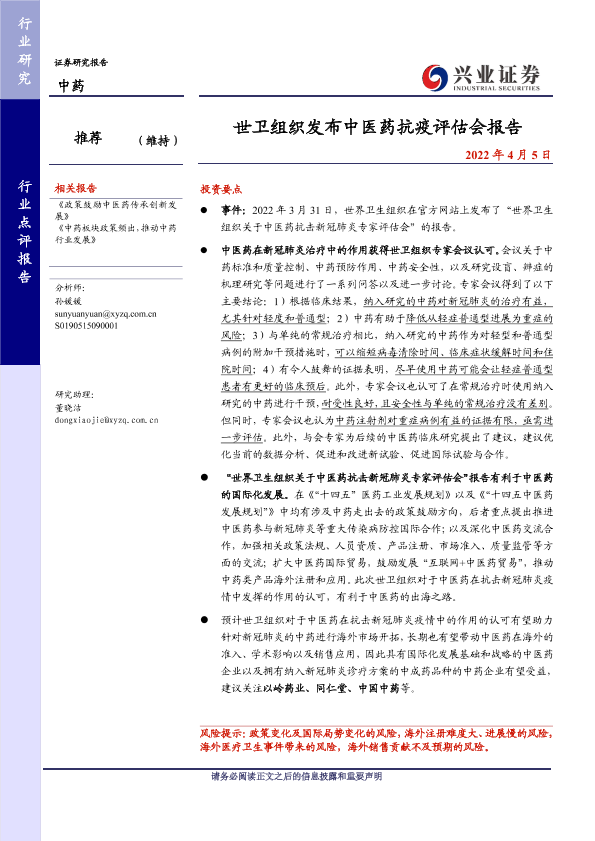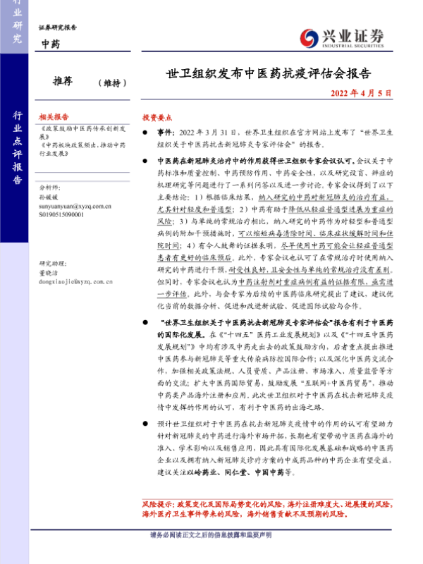 【兴业证券】【20220405】世卫组织发布中医药抗疫评估会报告-5页