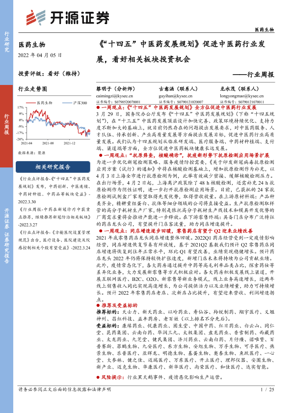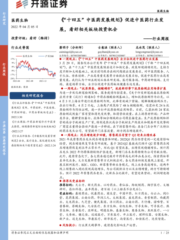 【开源证券】【20220405】'十四五'中医药发展规划促进中医药行业发展,看好相关板块投资机会-25页