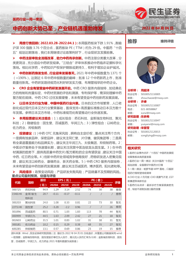 【民生证券】【20220406】医药行业一周一席谈:中药创新大势已至,产业链机遇蓬勃待发-19页