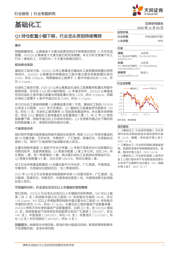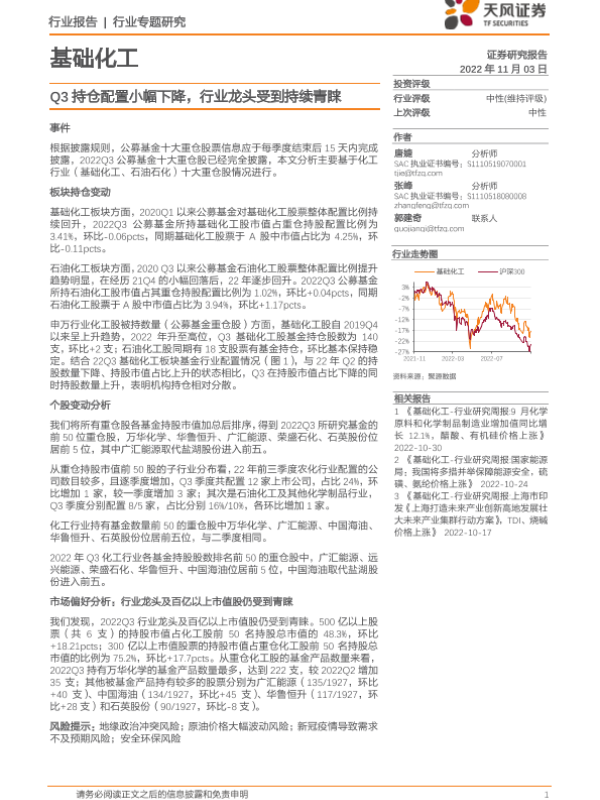 【天风证券】【20221103】基础化工行业专题研究:Q3持仓配置小幅下降,行业龙头受到持续青睐-16页