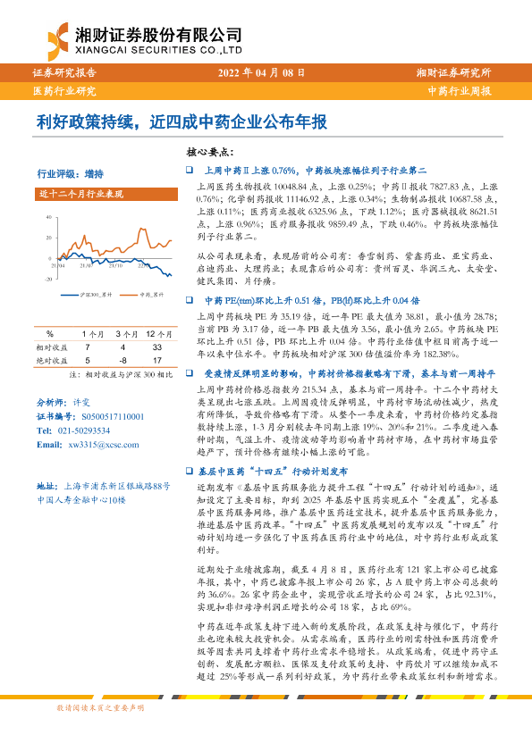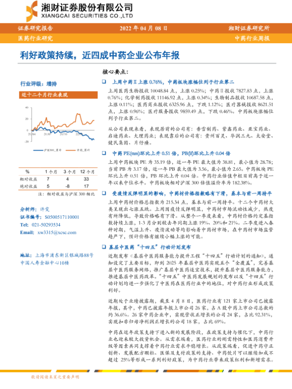 【湘财证券】【20220408】中药行业周报:利好政策持续,近四成中药企业公布年报-12页