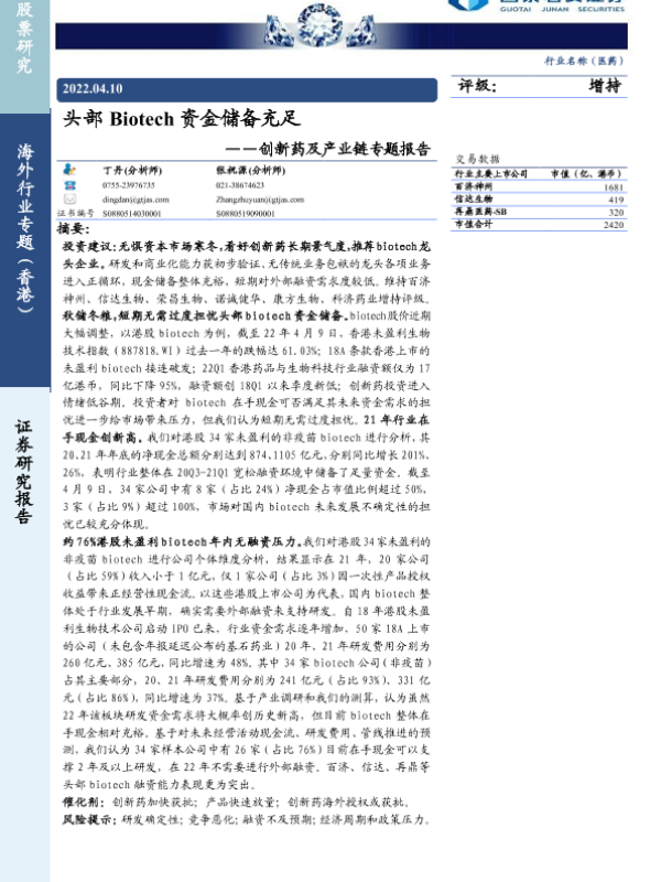 【国泰君安证券】【20220410】头部Biotech资金储备充足-4页