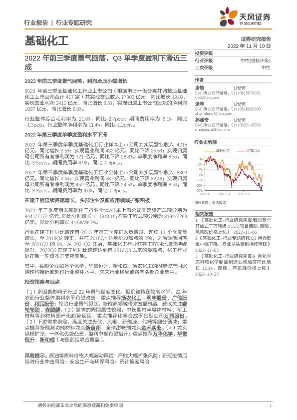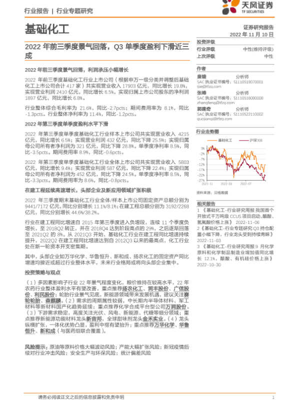 【天风证券】【20221110】基础化工行业:2022年前三季度景气回落,Q3单季度盈利下滑近三成-23页