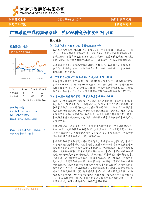 【湘财证券】【20220412】中药行业周报:广东联盟中成药集采落地,独家品种竞争优势相对明显-12页