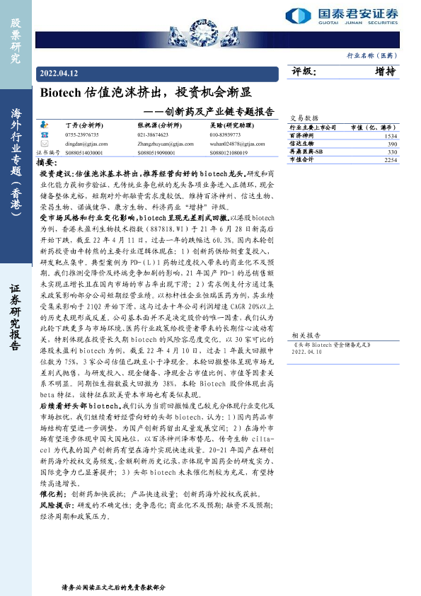 【国泰君安证券】【20220412】Biotech估值泡沫挤出,投资机会渐显-7页