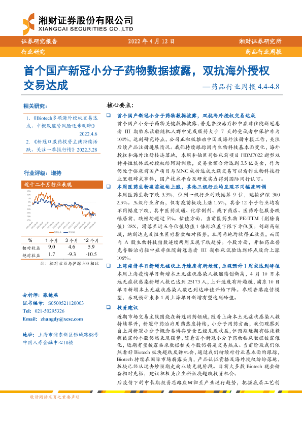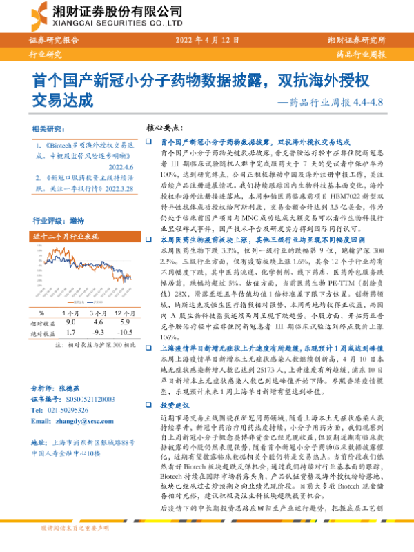 【湘财证券】【20220412】药品行业周报:首个国产新冠小分子药物数据披露,双抗海外授权交易达成-12页