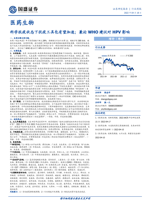 【国盛证券】【20220418】医药生物行业周报:科学抗疫状态下抗疫工具包有望加速;兼论WHO建议对HPV影响-26页