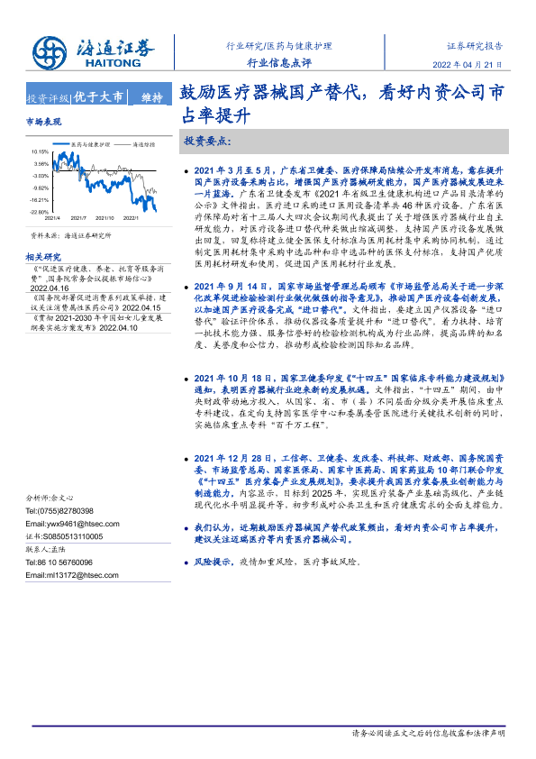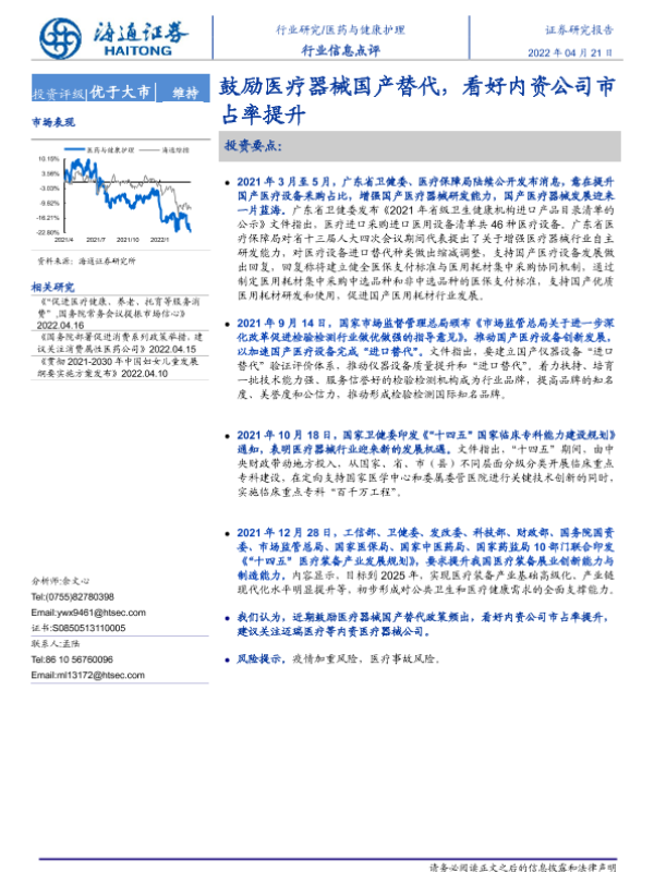 【海通证券】【20220421】医药与健康护理行业信息点评:鼓励医疗器械国产替代,看好内资公司市占率提升-2页