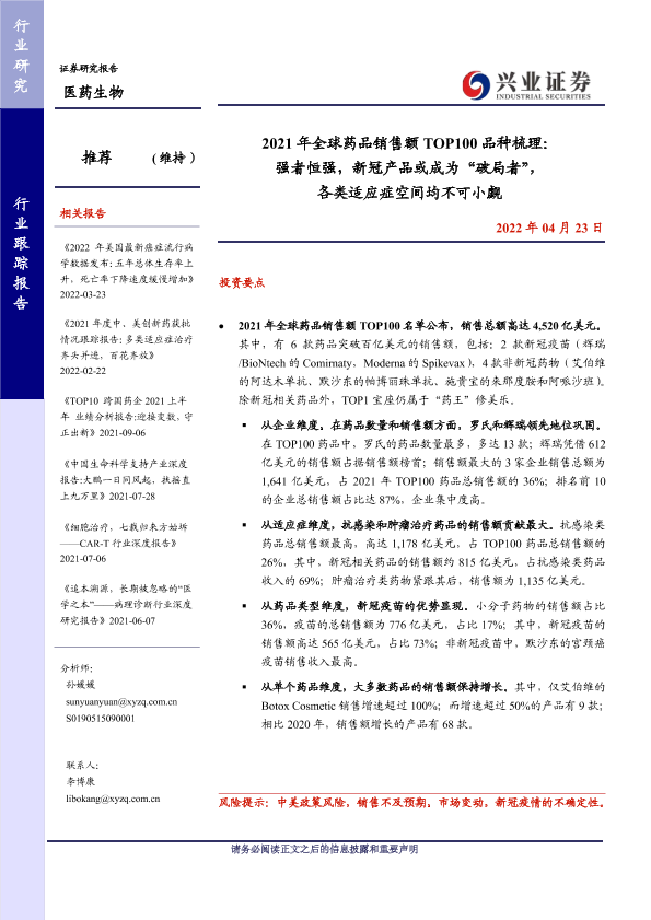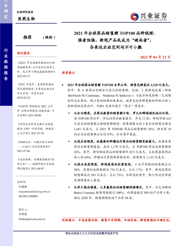 【兴业证券】【20220423】2021年全球药品销售额TOP100品种梳理-11页