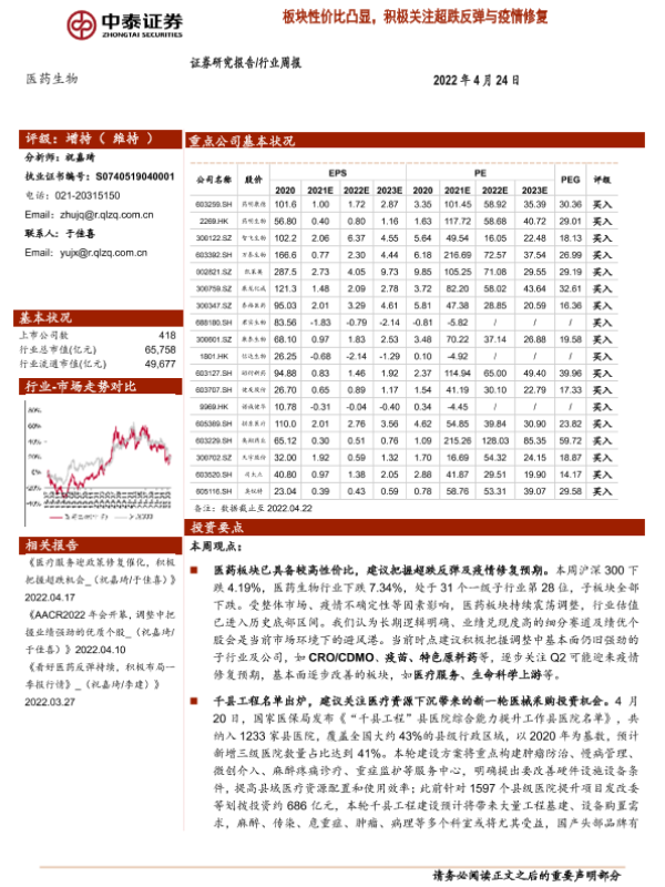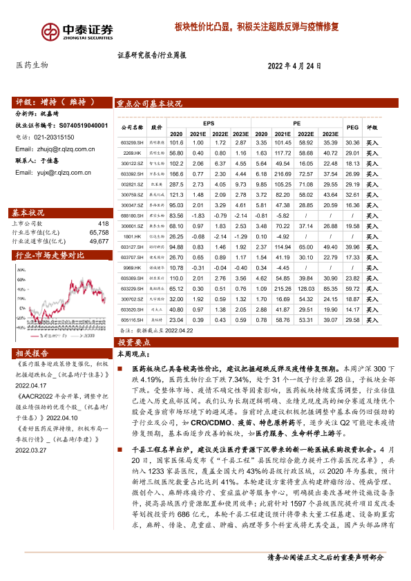 【中泰证券】【20220424】医药生物行业周报:板块性价比凸显,积极关注超跌反弹与疫情修复-12页
