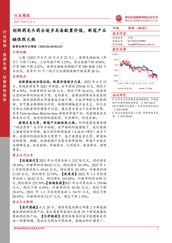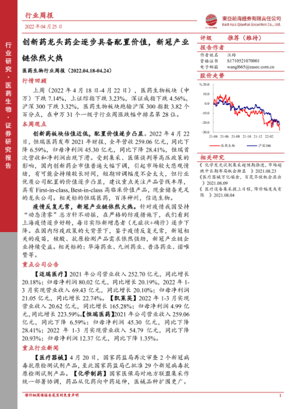 【东亚前海证券】【20220425】医药生物行业周报:创新药龙头药企逐步具备配置价值,新冠产业链依然火热-13页