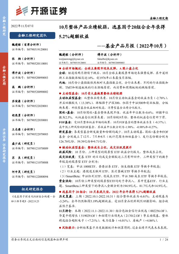 【开源证券】【20221107】基金产品月报(2022年10月):10月整体产品业绩较弱,选基因子20组合全年录得5.2%超额收益-24页