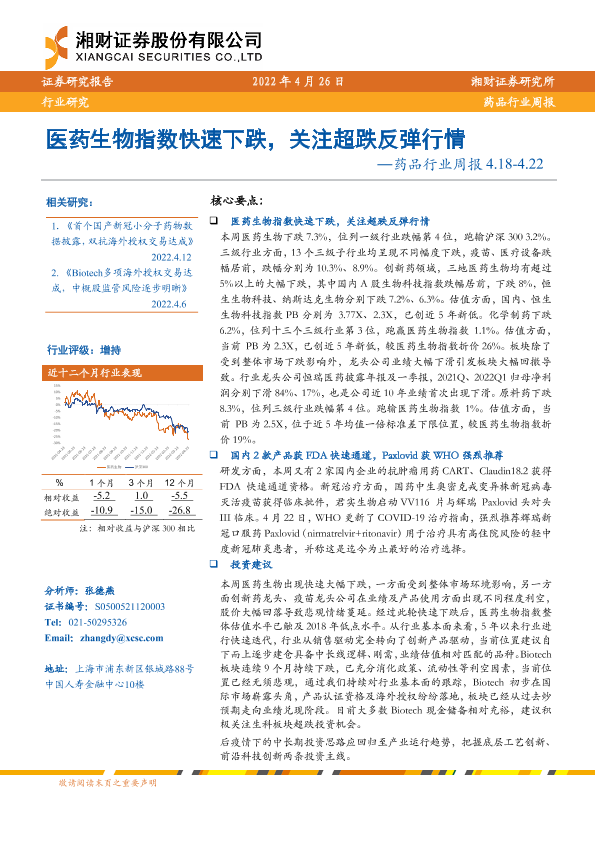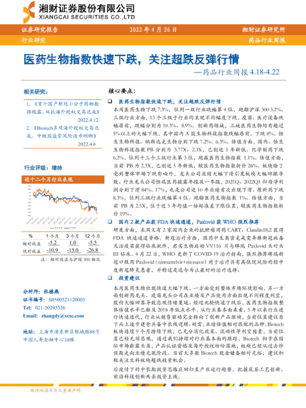 【湘财证券】【20220426】药品行业周报:医药生物指数快速下跌,关注超跌反弹行情-14页
