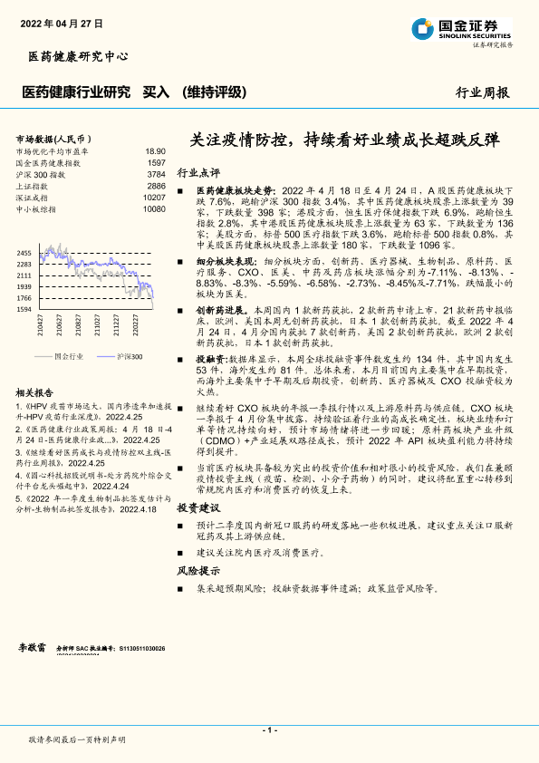 【国金证券】【20220427】医药健康行业研究:关注疫情防控,持续看好业绩成长超跌反弹-18页