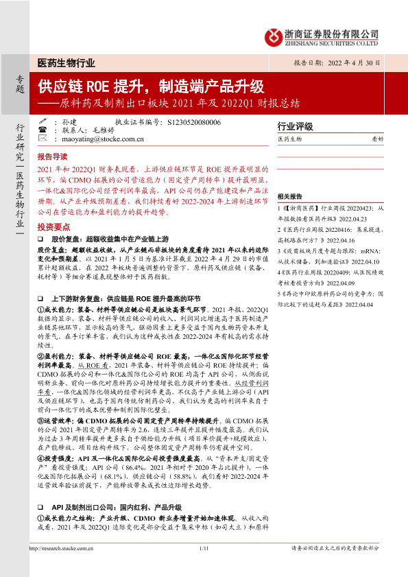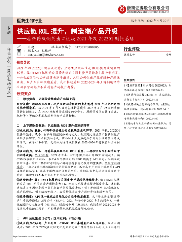 【浙商证券】【20220430】原料药及制剂出口板块2021年及2022Q1财报总结-11页