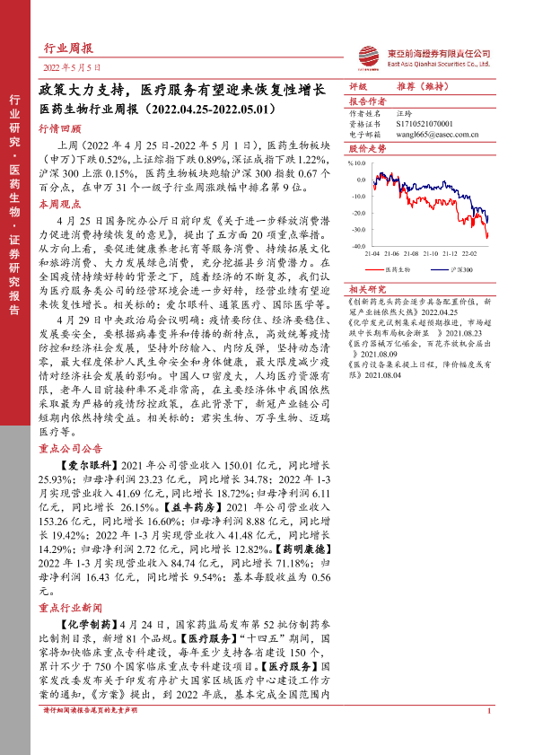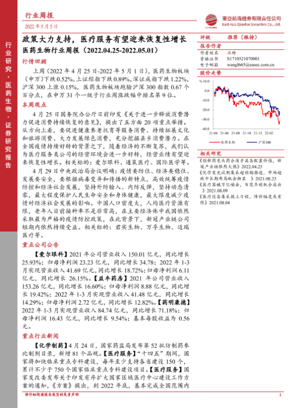 【东亚前海证券】【20220505】医药生物行业周报:政策大力支持,医疗服务有望迎来恢复性增长-13页