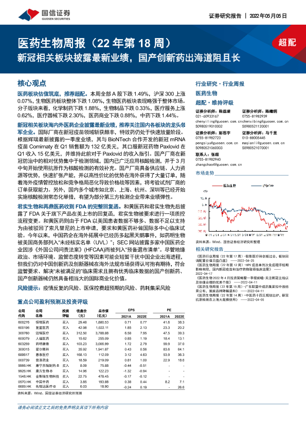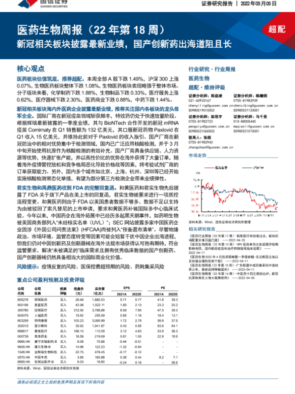 【国信证券】【20220505】医药生物周报:新冠相关板块披露最新业绩,国产创新药出海道阻且长-15页