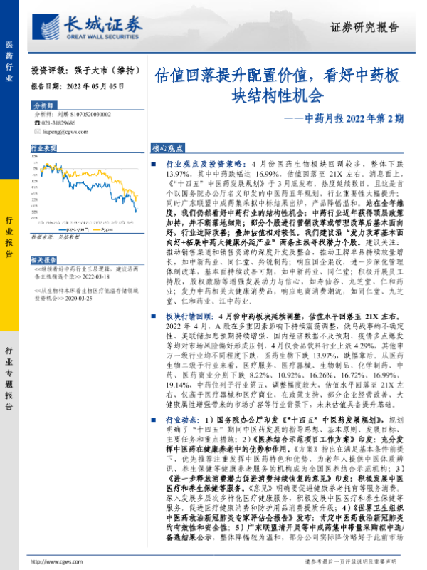 【长城证券】【20220505】中药月报2022年第2期:估值回落提升配置价值,看好中药板块结构性机会-13页